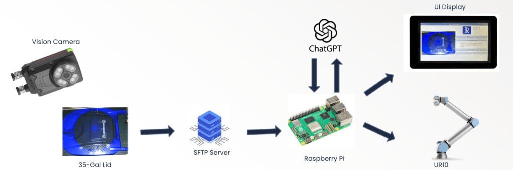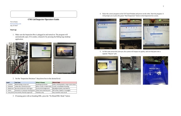 My favorite project, and the one that earned me Intern Project of the Year nationally, was developing a low-cost automated quality inspection system for cart lids that combines a Raspberry Pi, a cloud-based AI vision model (GPT-4o), and a UR10 Cobot. The goal was to create a system that could detect defects without the extensive pre-training required by most commercial solutions, making it adaptable to frequent changes in color, branding, and IML designs (see demo video above).
